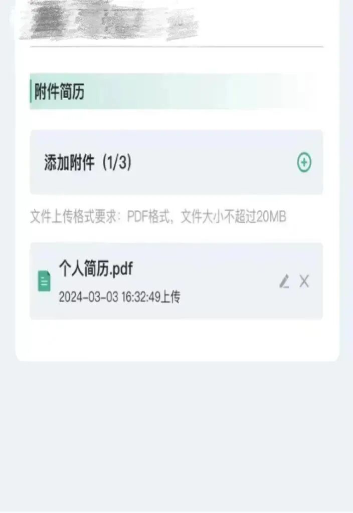 5、点击“附件简历”,添加个人制作简历的PDF形式进行上传。