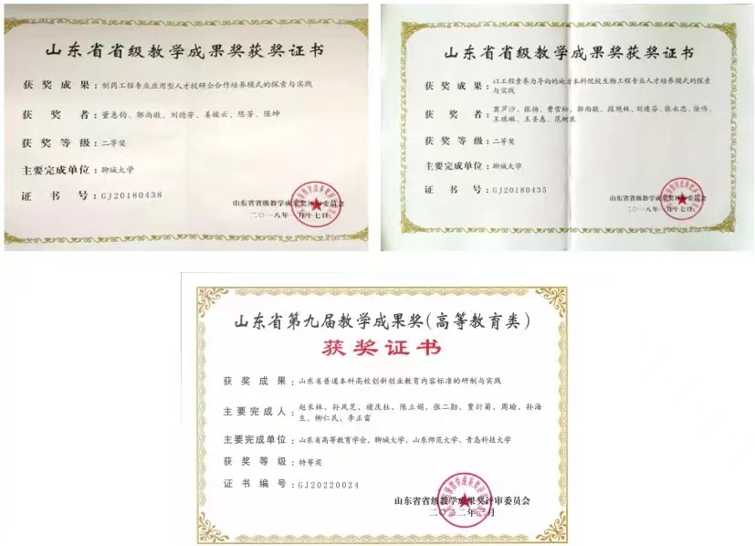 “十三五”期间,生物制药专业承担山东省高水平应用型重点建设专业项目,并于2019年获批山东省一流专业建设点;制药工程专业承担“山东教育服务新旧动能转换专业对接产业”项目。建设了《生物化学》、《药理学》、《药剂学》、《药物分析》和《药物化学》5门在线开放课程。2023年《生物化学》课程获批国家一流课程,2024年《分子生物学》课程获批山东省一流课程。学院共获批省级以上教学改革项目7项。出版教材2部(科学出版社),发表教研论文20篇,其中EI论文2篇,核心期刊6篇。本专业教师参加省部级教学竞赛9项,其中获国家级二等奖1项,三等奖2项,优秀奖1项。获山东省本科教学成果二等奖2项,特等奖1项。